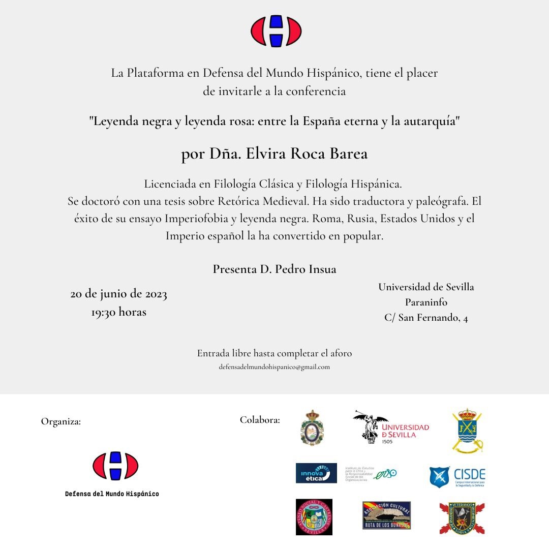 Dentro del intenso programa de actividades de difusión de la Cultura de Defensa, el CHCM Sur (Sevilla) colabora en la organización y difusión de la conferencia titulada “Leyenda Negra y leyenda Rosa: entre la España eterna y la autarquía”, el próximo 20 de junio a las 19:30 horas en el Paraninfo de la Universidad de Sevilla, sito en la C/ San Fernando 4 de la capital Hispalense.