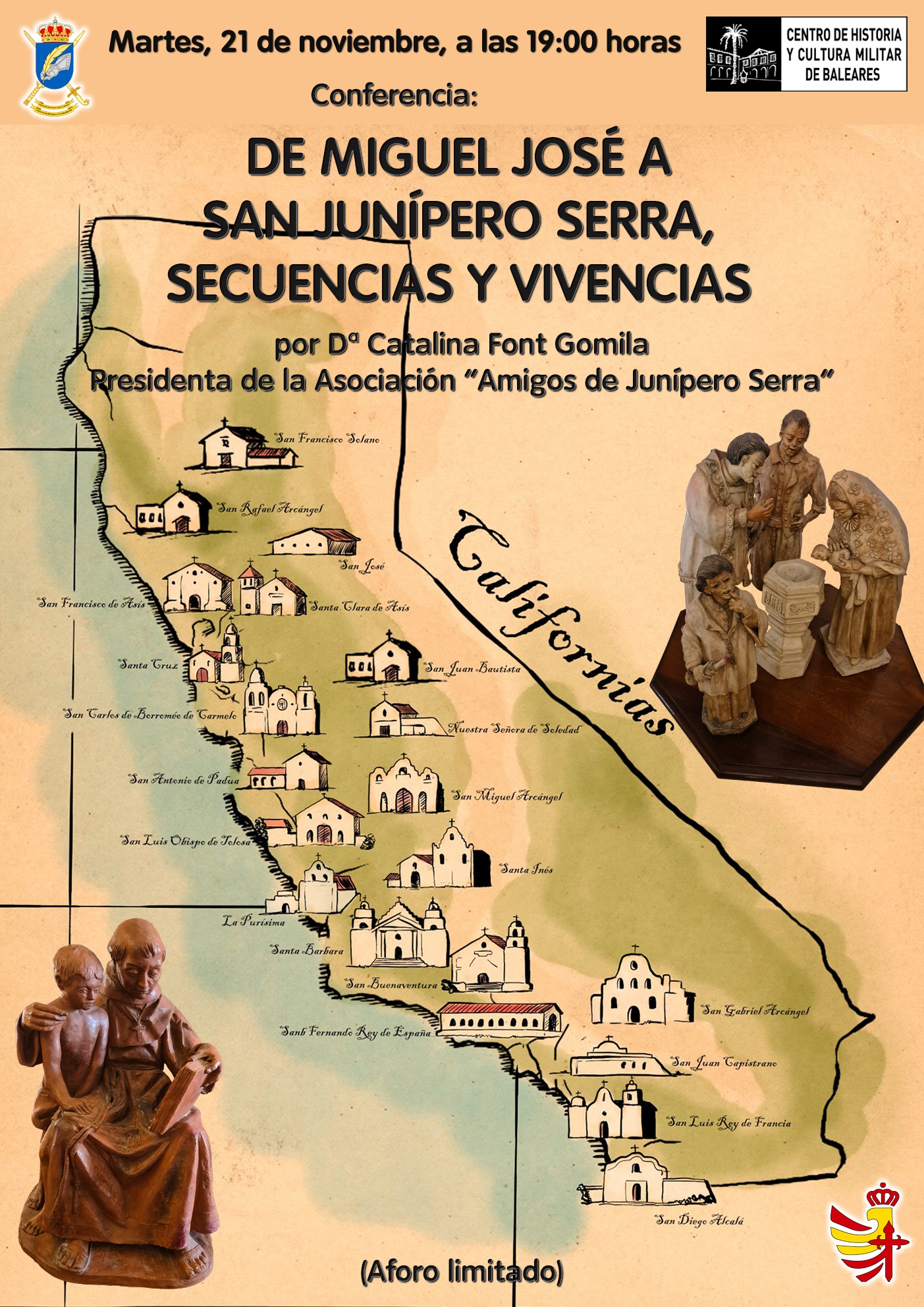 El proximo martes día 21 de noviembre a las 19.00h, tendrá lugar en la Sala Capitular del antiguo convento de Santa Margarita (C/San Miguel 69B, Palma), la conferencia “De Miguel José a San Junipero Serra, secuencias y vivencias”, que impartirá Dª Catalina Font Gomila, presidenta de la asociación “Amigos de Junípero Serra”.