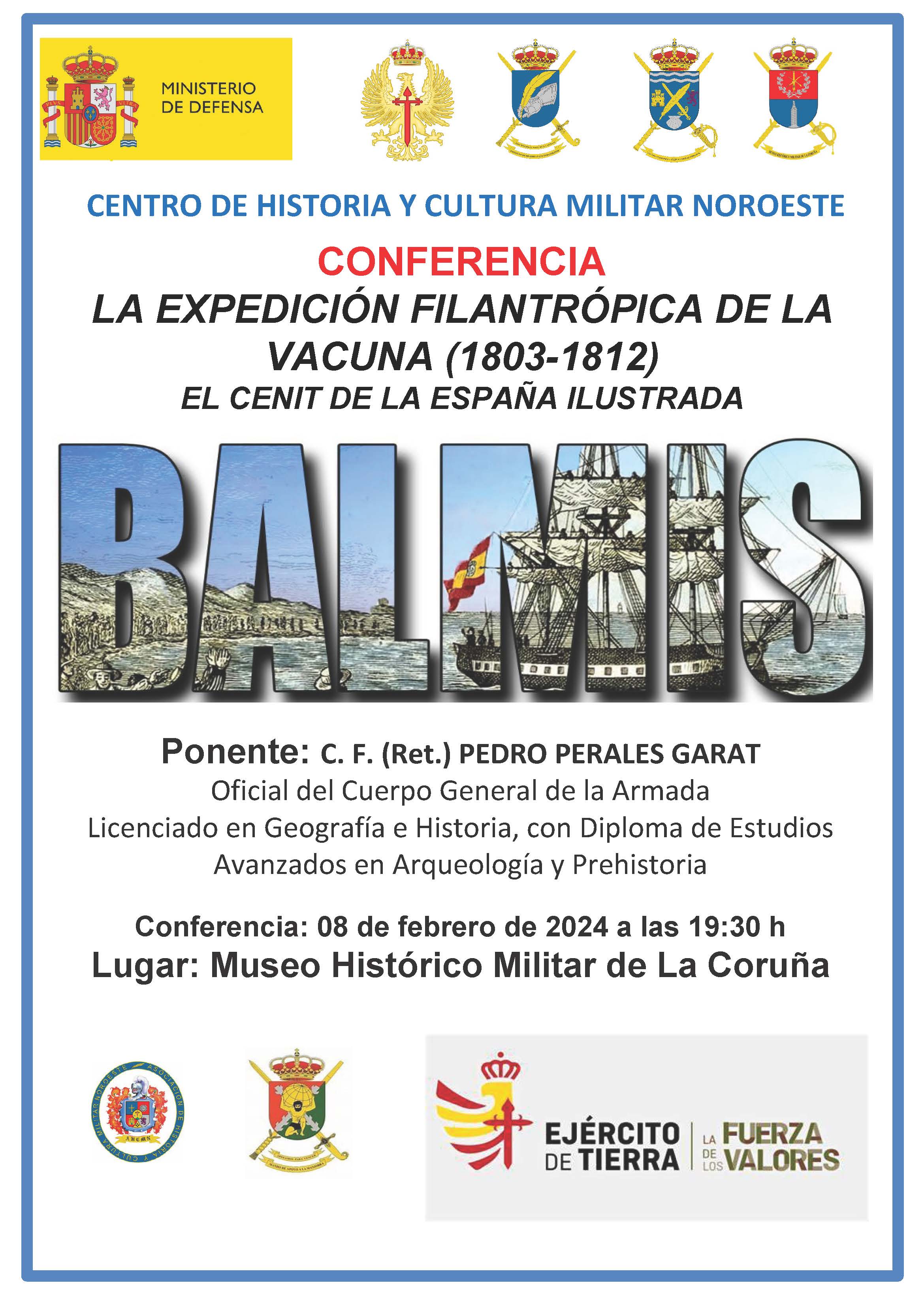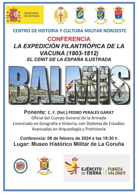 El próximo 08 de febrero de 2024, a las 19:30 horas, tendrá lugar en el Museo Histórico Militar de A Coruña (Plaza Carlos I, nº 1) la conferencia: “La expedición filantrópica de la vacuna 1803-1812”, que impartirá D. Pedro Perales Garat, Oficial de la Armada (C.F.retirado) y asesor-colaborador del Instituto de Historia y Cultura Naval.
