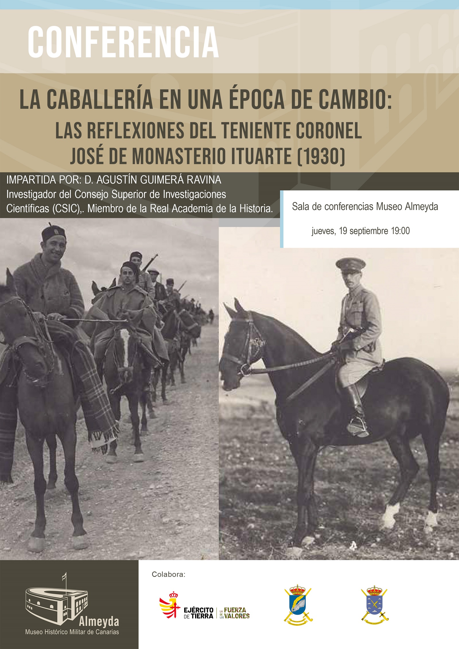 En el Museo Militar de Canarias tendrá lugar la conferencia bajo el título “La caballería española en una época de cambio: las reflexiones del teniente coronel José de Monasterio, 1930”, impartida por Agustín Guimerá Ravina, Investigador del Consejo Superior de Investigaciones Científicas (CSIC) y miembro de la Real Academia de la Historia. En esta ocasión nos habla del general africanista José de Monasterio Ituarte (1882-1952), líder de la caballería española en aquella época y que es un gran desconocido.