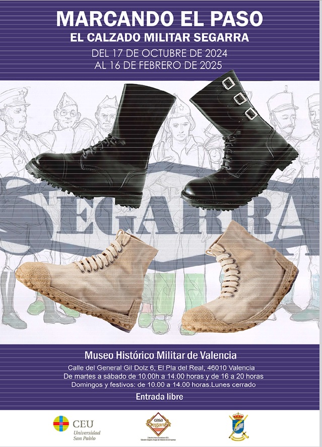 El próximo día 17 de octubre de 2024 en el Museo Histórico Militar de Valencia se inagurará la exposición temporal “Marcando el Paso. El Calzado Militar Segarra” bajo la presidencia del general Director del Instituto de Historia y Cultura Militar, Antonio Ruiz Benítez. La exposición, que será presentada por su comisaria Mónica Ruiz Bremont, permanecerá expuesta en el Museo Militar hasta el 16 de febrero de 2025.
