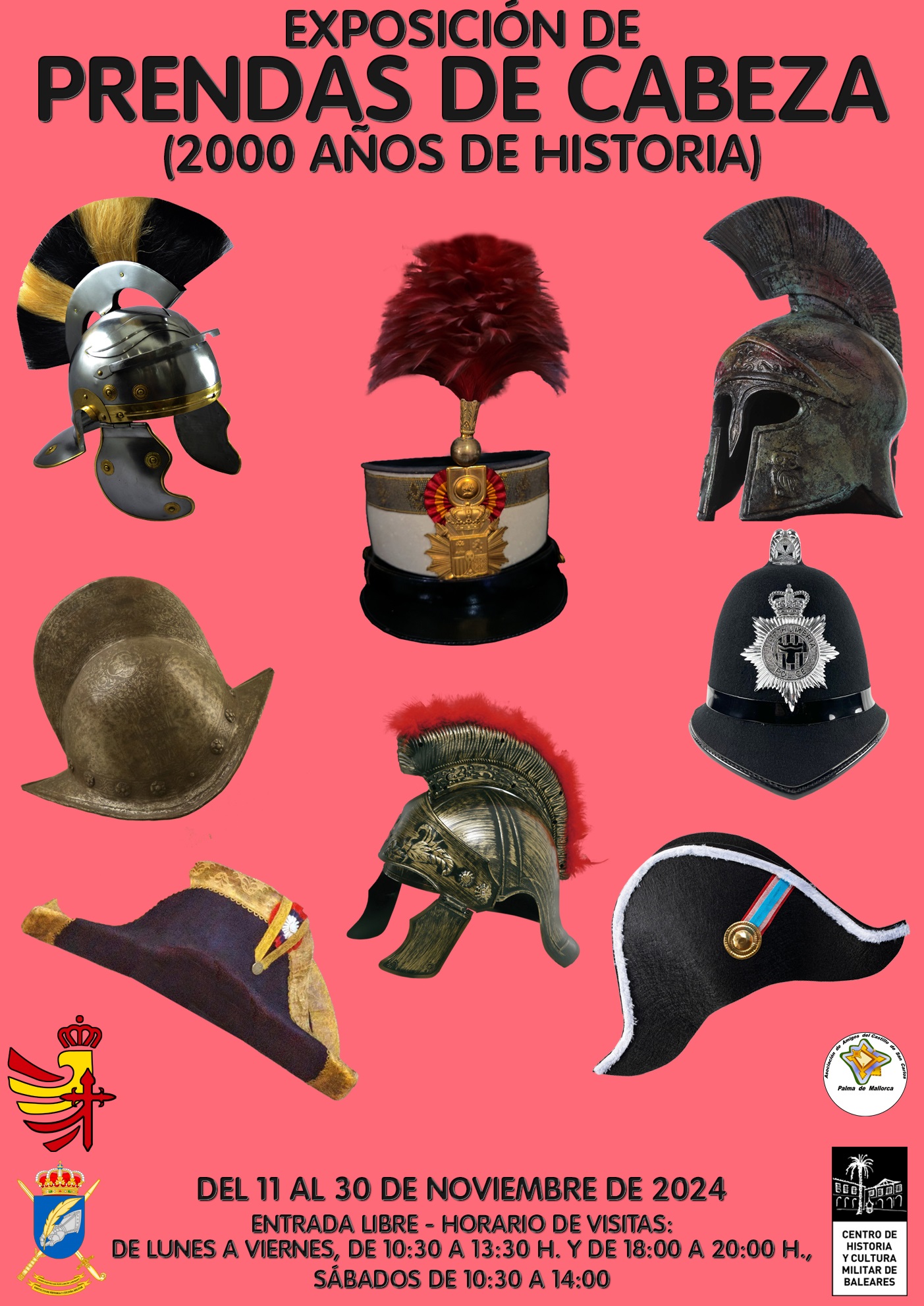 El próximo lunes, día 11 de noviembre, a las 19:00 h, tendrá lugar en el claustro del antiguo convento de Santa Margarita (C/San Miguel 69B, Palma), sede del Centro de Historia y Cultura Militar de Baleares, la inauguración de la exposición “ 2.000 años de historia de las prendas de cabeza (gorros y cascos)”.