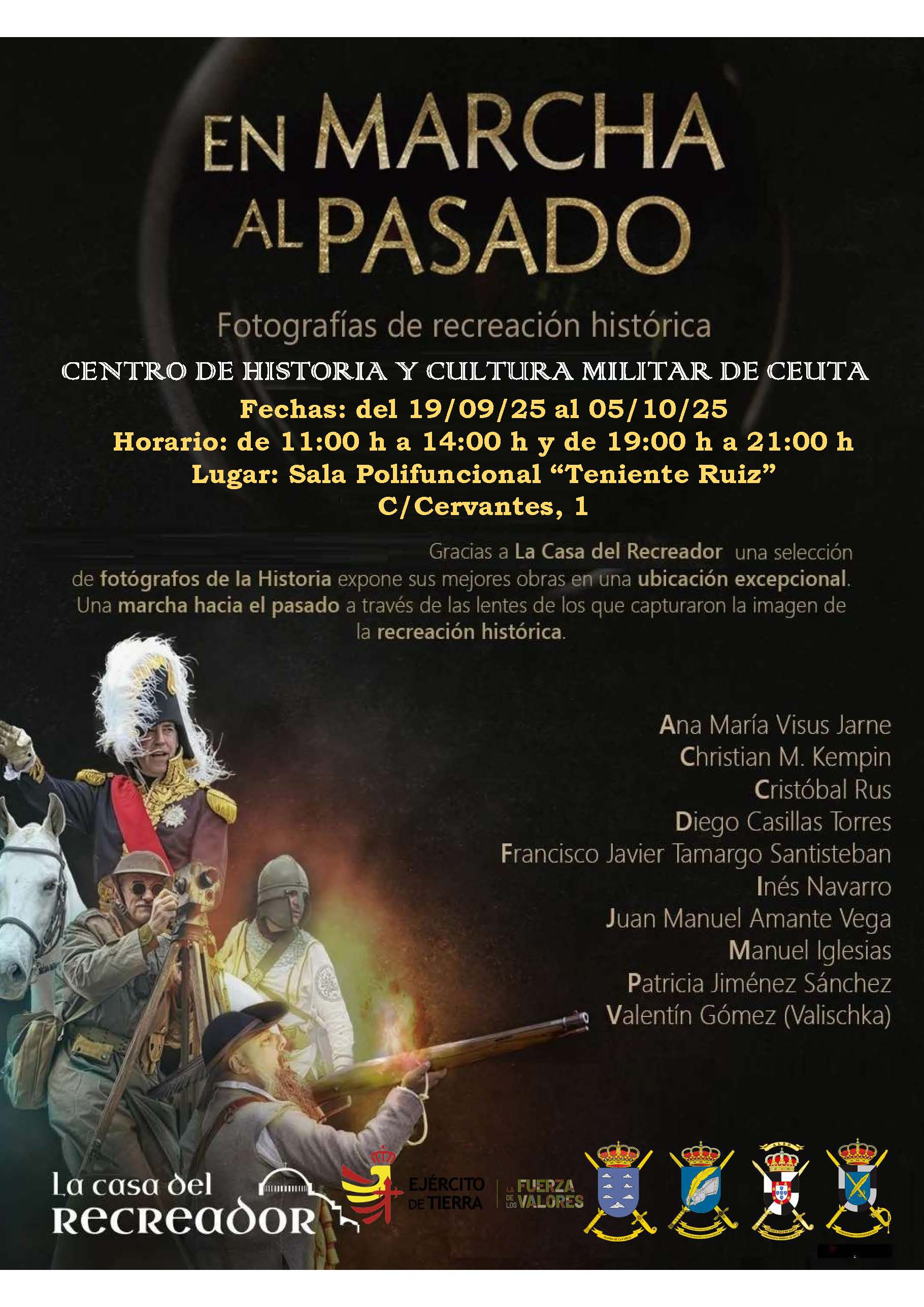 Bienvenidos a la exposición "En marcha al pasado". Gracias a La Casa del Recreador, de Sevilla, al Museo Histórico Militar de Sevilla y al CHCM de Ceuta, una selección de fotógrafos de la Historia expone sus mejores obras en una Plaza militar tan llena de Historia como es Ceuta. Una marcha hacia el pasado a través de las lentes de los que capturaron imágenes pretéritas. Un pasado lleno de enfrentamientos bélicos que surcaron la historia de España y Europa, dejando su huella en la retina de sus contemporáneos.