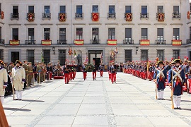 A las 10:50, estas Enseñas Nacionales fueron recibidas con los honores de ordenanza correspondientes por el Batallón Guardia Vieja de Castilla, que al Mando del Tcol. D. DIEGO JIMÉNEZ GAVILÁN fue responsable de marcar los tiempos de la Parada Militar de esta Jura de Bandera presidida por el TG. EXCMO SR. D. RAMÓN PARDO DE SANTAYANA Y GÓMEZ DE OLEA.