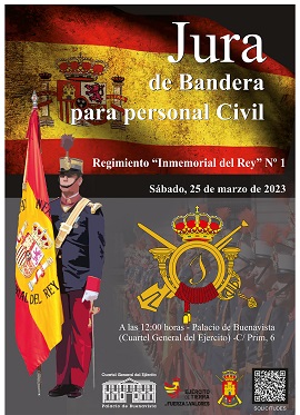 El 25 de marzo de 2023, tendrá lugar la JURA DE BANDERA para personal civil, en el Cuartel General del Ejército de Tierra (Palacio de Buenavista), organizado por el REGIMIENTO DE INFANTERÍA “INMEMORIAL DEL REY” Nº 1.