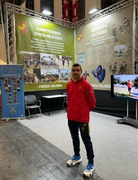 El cabo Jairo de la COMGEMEL participa en el Stand del Ejército de Tierra como representante de alto nivel en carreras por montaña.
