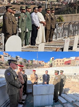 Posteriormente se realizaron ofrendas y responsos en los diferentes enterramientos de las parcelas y panteones del cementerio municipal y seguidamente, el comandante general se desplazó a los cementerios hebreo y musulmán donde también rindió tributo a los caídos por España enterrados en estos cementerios.