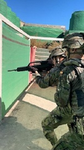 A lo largo de toda la instrucción, los combatientes han entrado en contacto con el escenario urbano aplicando los conceptos básicos de movimiento por el interior de una edificación. Inicialmente, se ha puesto en práctica el avance y progresión por pasillos y pasos estrechos en interiores. Así mismo, se ha procedido a la práctica de limpieza de habitaciones mediante distintos métodos, teniendo que identificar el tipo de objetivo y tomando la decisión de abatirlo o no; si la amenaza encontrada era una fuerza propia (simulado con un globo de color verde), o si era enemiga (simulado mediante globo de color rojo).