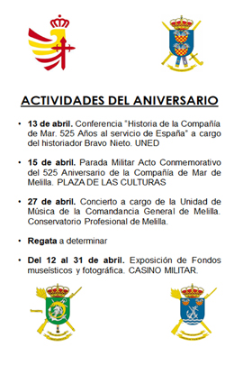 Una exposición con fondos museísticos y fotografías en el Casino Militar, del 12 al 31 de abril; Conferencia sobre la “Historia de la Compañía de Mar: 525 años al servicio de España” a cargo del cronista oficial de Melilla, Antonio Bravo, en la UNED, el día 13 de abril; El acto central, que consistirá en una Parada Militar en la Plaza de las Culturas, el día 15 de abril; Concierto de música de la Comandancia General de Melilla en el Conservatorio Profesional de Música de Melilla el próximo 27 de abril y la regata que en el mes de mayo se realizará en colaboración con la Delegación de Defensa y Real Club Marítimo de Melilla.