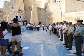 La ofrenda floral en la Plaza de los Pescadores estuvo precedida por una misa en la iglesia Castrense y una pequeña procesión desde la misma hasta el lugar de la ofrenda donde la imagen de la Virgen del Carmen, de la Compañía de Mar de la Unidad Logística 24 de Melilla, fue trasladada por las Damas del Carmen.