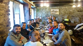 Una vez en la Venta de “Juan Pito”, este año optamos por el tan socorrido plato de huevos fritos con jamón y patata fritas, regado con vino, gaseosa y agua, dejando para otras fechas las deliciosas migas por las que es tan famosa dicha venta. Después de las fotos, los cafés, las risas y anécdotas de nuestros veteranos, nos despedimos de los amigos de Jaca para emprender la vuelta a Pamplona por la carretera de Ochagavía, donde paramos a reponer líquidos, para continuar por Aoiz y llegar a Pamplona a buena hora para comer con la familia.