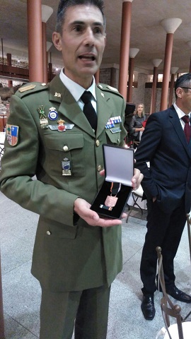 A continuación se entregaron los premios a los galardonados, siendo el Bgda. Gutierrez uno de ellos, concediéndosele una merecida MEDALLA DE BRONCE UGFAS, por haber conseguido el mayor número de cinturones negros en Unidad tipo Regimiento. Este premio no es más que el reconocimiento a todo el duro trabajo que ha realizado el Brigada Gutierrez, con la colaboración de los mandos y tropa del Regimiento “América” 66, desarrollando un exigente programa de Combate Cuerpo a Cuerpo e Intervención no Letal, que ha sabido conjugar de forma sobresaliente con todas las demás actividades de instrucción y adiestramiento. Una vez más el trabajo bien hecho da sus frutos.