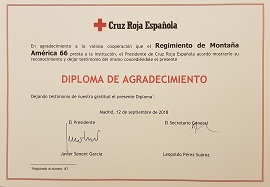 El pasado día 22 de septiembre fue entregado al Regimiento ''América'' el Diploma de Agradecimiento otorgado por Cruz Roja Española en reconocimiento al apoyo y cooperación que la unidad presta a las actividades que Cruz Roja desarrolla.