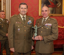 El general de brigada Alfonso Pardo de Santayana Galbis, jefe de la BRILAT, recogió el galardón del Trofeo GEJEME de manos del general de ejército Amador Enseñat y Berea, Jefe de Estado Mayor del Ejército, en un sencillo acto celebrado en el Palacio de Buenavista, sede del Cuartel General del Ejército de Tierra, en el marco de la audiencia anual a personas y unidades destacadas en el ámbito de la preparación física militar.