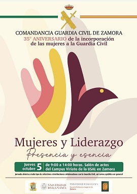 Con motivo del 35º aniversario de la incorporación de la mujer a la Guardia Civil, se ha desarrollado, el dia 05 de octubre en el Campus Viriato de la Universidad de Salamanca en Zamora, una jornada con el titulo de "Mujeres y Liderazgo, Presencia y Esencia", organizada por la Guardia Civil de esta localidad.