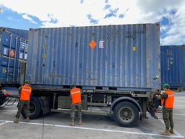 El pasado día 5 de octubre, la Compañía de Transportes del Grupo de Apoyo Logístico I/81, realizó un transporte de 7 contenedores de munición desde la Unidad de Municionamiento i/81, en su ubicación del Acuartelamiento de Geneto, hasta la terminal de carga del muelle de Santa Cruz de Tenerife, para su embarque con destino a la isla de Fuerteventura.