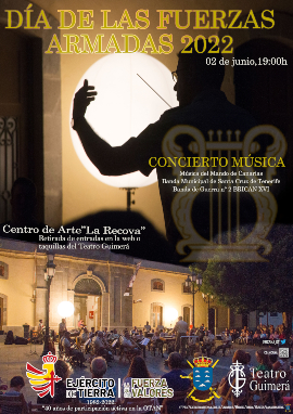 Jueves, 2 de junio, en el en el Centro de Arte “La Recova” a las 19:00 horas, a cargo de la Música del Mando de Canarias, Banda de Guerra nº 2 de la Brigada Canarias XVI y Banda Municipal de Santa Cruz de Tenerife.