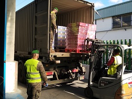 Integrado en la operación Balmis, el Grupo de Abastecimiento I/21 (GABTO I/21) de la Agrupación de Apoyo Logístico nº. 21 realizó el 14 de abril el transporte, en apoyo al Banco de Alimentos de Sevilla, de 11 palés con un total de 7.400 kilogramos de víveres, donados por supermercados DIA, desde la base logística de la cadena en Dos Hermanas hasta la sede operativa de la entidad benéfica en el polígono Store de Sevilla.