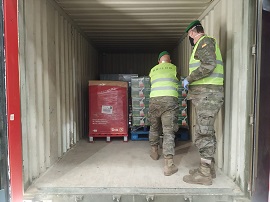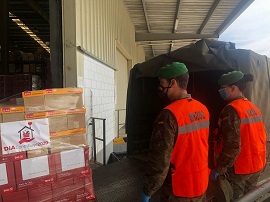 Donados por el grupo DIA, el GTP III/21 traslada los alimentos desde Jaén y Antequera, compaginando las actividades de la operación Balmis con los cometidos permanentes en territorio nacional.