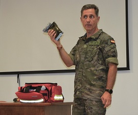 Previa a la entrega de los mismos, el Jefe de los Servicios Sanitarios impartió una conferencia a todos los conductores del GTP III/21 asistentes sobre el uso del botiquín y su contenido, donde remarcó la importancia de la formación sanitaria para poder atender cualquier incidencia tanto propia como ajena.