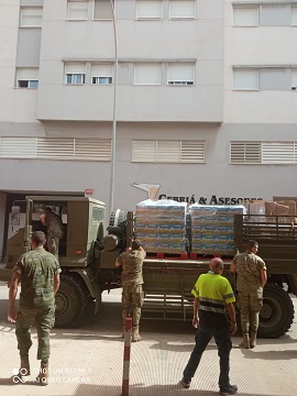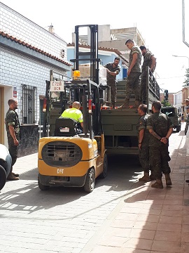 En esta altruista actividad se han empleado algunos recursos humanos y materiales del GAAA I/74, poniendo a disposición de la Asociación 4 vehículos y 11 militares de diferentes empleos, liderados por el sargento Gómez. En total han sido 44 palets con más de 25000 kilogramos de alimentos con destino a la Fundación Adra y a siete parroquias que serán las encargadas de su entrega en La Línea de la Concepción.