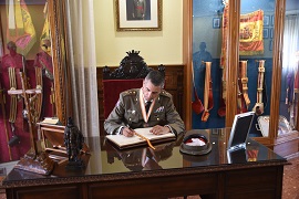 En sus palabras de despedida el general hizo un repaso a su vida militar desde el día en el que se convirtió en alférez, haciendo especial énfasis en que todo el éxito es fruto del trabajo y remarcando la importancia de la familia en la vida de un militar. No faltaron palabras de agradecimiento a los miembros del Mando de Transmisiones, del NRDC SP, en especial a los componentes de la División CIS, a sus órdenes; ni a aquellas Unidades que, como Comandante Militar de Valencia y Castellón, tanto le han apoyado en esta tarea. Finalizó el discurso con los vivas reglamentarios y posteriormente en la firma del Libro de Honor del Regimiento de Transmisiones nº21 dio su última orden como General Jefe del Mando de Transmisiones: “Continuad siendo ejemplo de combatientes y los primeros en Transmisiones.”