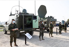 Posteriormente la Ministra pudo ver una exhibición de diferentes soportes de comunicaciones  de dotación del RT 21 (estaciones satélite, estaciones radio), en la que destacó, por novedosa, la radio 7200- HH del sistema radio E-Lynx, sistema que ofrece una familia de radios (versiones vehicular, de mochila y de mano)  de alta capacidad    definidas por software. La citada radio y el centro de  gestión de claves y redes del sistema E-Lynxhan sido recientemente adquiridos, por la Dirección de Armamento y Material (DGAM) del Ministerio al consorcio Telefónica- Elbit-Aicox, y están demostrando unas altísimas prestaciones en los cursos de formador de formadores de operadores radio y de gestión de redes que, dirigidos por la DGAM,  están realizando oficiales y suboficiales, de la Fuerza Terrestre, en las instalaciones del Centro de Preparación de los CIS desplegables del Regimiento de Transmisiones 21.
