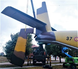 Esta semana, a petición del Ala 37, la Agrupación de Apoyo Logístico n.º 61 (AALOG 61-BRILOG) ha contribuido a la colocación del timón de cola de uno de estos últimos Caribou -que permanece expuesto en la Base Aérea de Villanubla. Personal del Grupo de Mantenimiento II/61 (GMANTO II/61) ha facilitado asesoramiento técnico de su personal especialista y el apoyo de una grúa modelo “Luna GT-12/16-R” para llevar a cabo exitosamente la operación.