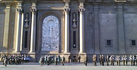 Tras los pasacalles que recorrieron diversas calles de la capital aragonesa, interpretando distintas marchas militares, se realizó un acto militar en la plaza del Pilar, donde se rindió homenaje a los que dieron su vida por España.