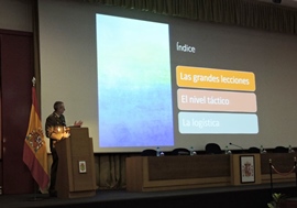 En su conferencia el coronel expuso un análisis del conflicto en los niveles estratégico y operacional identificando los aspectos y tecnologías que lo están caracterizando y las inferencias que podemos extraer de cara a futuros enfrentamientos.
