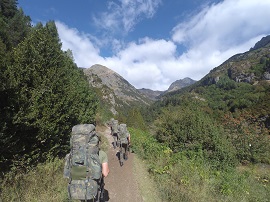 Posteriormente se afrontó la bajada (de mayor extensión kilométrica) en el que se descendieron 1185 metros sorteando diversos cauces, ibones y embalses hasta que las dos compañías alcanzaron el punto final de la marcha en los denominados Baños de Panticosa dando por terminada esta primera fase de la instrucción de los cadetes.
