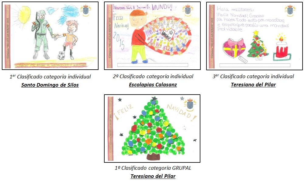 Todas las postales navideñas, recibidas en esta edición del certamen, han sido enviadas nominalmente a cada uno de los componentes de Fuerzas Pesadas que se encontraban desplegados en las misiones de Irak y Mali. Estamos seguros que con la dedicación en sus trabajos los niños han hecho llegar su cariño a nuestros compañeros, alcanzando con creces el objetivo que se pretendía de transmitirles el mensaje de que verdaderamente ¡NO ESTAIS SOLOS!.