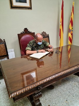 Tras ser recibidos por su Alcalde D. Luis Miguel Casajus Ciudad, el coronel Zaloña firmó en el libro de honor de la villa visitando a continuación el Parque de la Corona de dicha localidad, donde se había plantado una carrasca y colocado una pieza de cerámica en recuerdo de las víctimas de la pandemia del COVID-19.