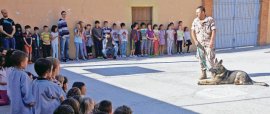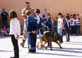 Atónitos e ilusionados se mostraron el pasado día 29 de mayo los más de 300 alumnos del Colegio Santísima Trinidad de Pinilla en Zamora con la actividad sobre adiestramiento de perros que impartió el Cabo Mayor y guía cinológico destinado en la AALOG 61 A. Rodríguez.. Los estudiantes asistieron primero a una explicación práctica, que estuvo enfocada a la sensibilización y el respeto al animal. El Cabo Mayor compartió con los alumnos la importancia del adiestramiento de estos animales, que son clave para la detección de drogas o personas atrapadas en alguna catástrofe. Asimismo, los alumnos recibieron algunas pequeñas recomendaciones para tratar con sus mascotas y cómo darles ciertas pautas de comportamiento para cuando salgan a pasear con ellos.
