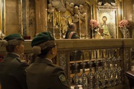Miembros de la Brigada Logística (BRILOG) han acudido a la Basílica del Pilar para realizar una ofrenda de flores ante la Virgen del Pilar de Zaragoza, que ha lucido de nuevo el manto, bordado en color verde, con el emblema de la BRILOG.