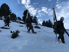 Los artilleros del módulo Elemental han realizado teóricas relativas a vida y movimiento en montaña invernal, repasado las prácticas de progresión con piolet y crampones, distintos procedimientos de autodetención, movimiento con raquetas, procedimientos de evacuación en camilla, rescate organizado ante un alud y búsqueda de víctimas con el localizador electrónico de víctimas de avalanchas (LEVA). Además, se ha realizado una triple jornada con equipo completo con raquetas, pernoctando en tienda protegida en condiciones meteorológicas de lluvia, nieve y viento, propias de las borrascas que han azotado el macizo pirenaico. Una vez evaluado todo el personal a instruir de este módulo, se realizó una marcha con esquís, donde todos los componentes tuvieron que poner en práctica, por fuera de pista, todos los conocimientos adquiridos a lo largo de toda la ITM.
