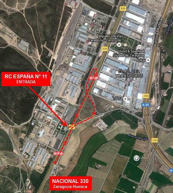 Desde Zaragoza: • Procedente de Zaragoza, por la carretera de Huesca (A-23), hasta Salida Ciudad del Transporte (Km. 7), realizar cambio de sentido por debajo de la carretera nacional, seguir por vía de servicio dirección Zaragoza hasta acceso a la base en el km. 6,5..