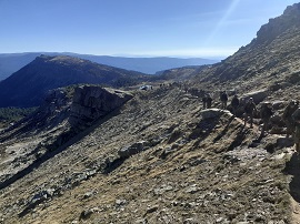 Tras un breve descanso, se inició el descenso pasando por las inmediaciones del nacimiento del Río Duero (2140 metros). Se prosiguió hasta la Laguna Helada, la cual se rebasó por su vertiente Sur, y se continuó hasta alcanzar el punto de partida, el aparcamiento del Paso de la Serrá.