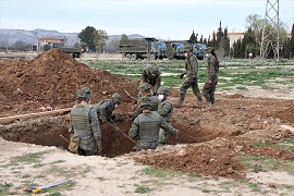A continuación, los alféreces cadetes comenzaron los trabajos en colaboración con la Compañía de Ferrocarriles, la cual les apoyó con trabajos de máquinas y materiales tales como, Abri Shelter, hesco-bastion, alambrada y otras herramientas y equipos. El objetivo era el planeamiento y montaje de un Check-Point, y un refugio enterrado de pelotón, además de familiarizarse con los materiales de Ingenieros en cometidos de fortificación.