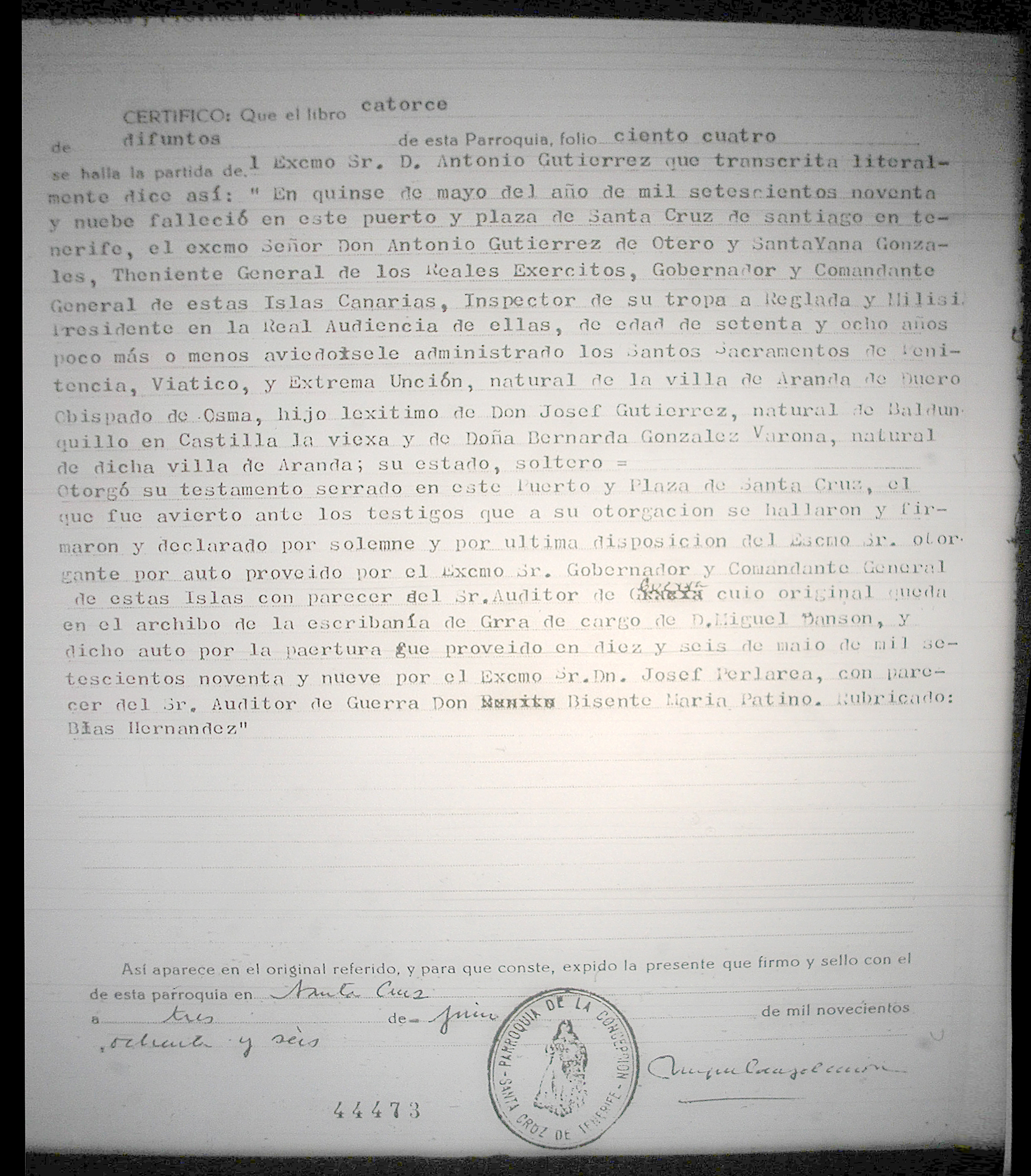 El 15 de Mayo de 2016 se celebra una efemérides muy significativa para de estas islas, y para todos los españoles, se trata del 217 Aniversario del fallecimiento del General D Antonio Gutierrez y Otero que falleció en Santa Cruz de Tenerife el 15 Mayo de 1799, según consta en la partida de defunción, pudiéndose visitar su tumba en un lateral de la Iglesia de la Concepción de esta ciudad