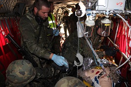 El curso ha finalizado con un ejercicio final de entrenamiento FTX-LIVEX, de dos días de duración, ambientado en las primeras fases de una Operación de Estabilización y con el apoyo de la Unidad de Simulación, Control y Arbitraje de la Brigada de Sanidad. Durante este ejercicio cabe destacar la actuación de los alumnos en un ejercicio situacional de gestión de un incidente IED, en el que tuvieron que cubrir secuencialmente todas las acciones de la cadena asistencial, bajo la supervisión del personal instructor y resolviendo los eventos inyectados por estos, desde la asistencia inicial a las bajas, su estabilización en el terreno, su puesta en estado de evacuación, y su evacuación y transferencia a la FST de destino, para lo que se proyectó una capacidad RW-MEDEVAC sobre HT-17 CHINOOK del BHELTRA V.