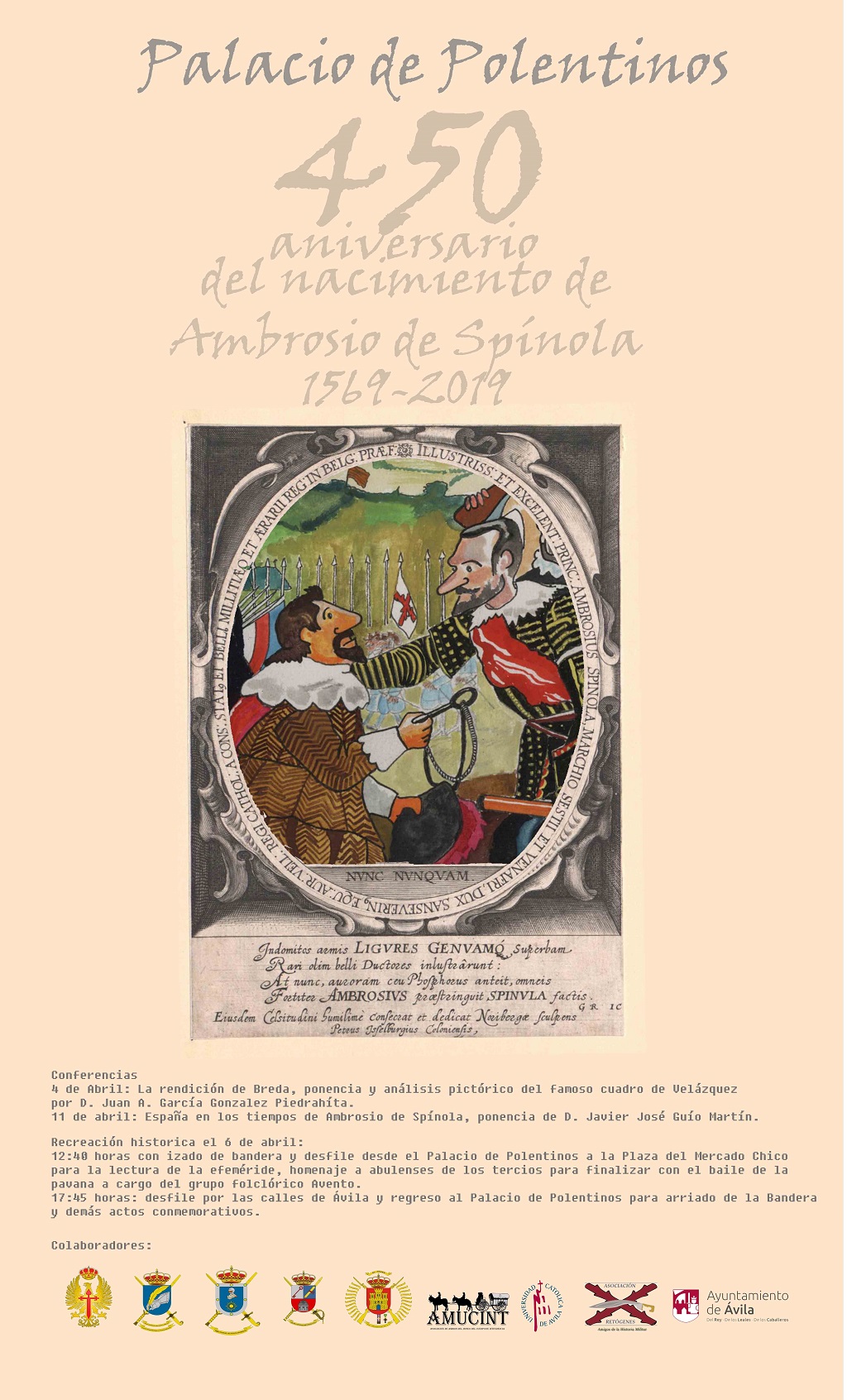 España en los tiempos de Ambrosio de Spínola, por Don Javier José Guío Martín, Director de la Catedra de Cultura de Defensa "Julián Vallespin" de la Universidad Católica de Ávila, y una jornada de recreación histórica el día 6 del mismo mes en el Archivo General militar de Ávila y por las calles de la Ciudad, con la colaboración de Ayuntamiento de Ávila, la Universidad Católica de Ávila, el pífanos y tambores del RI nº1 "inmemorial del Rey".