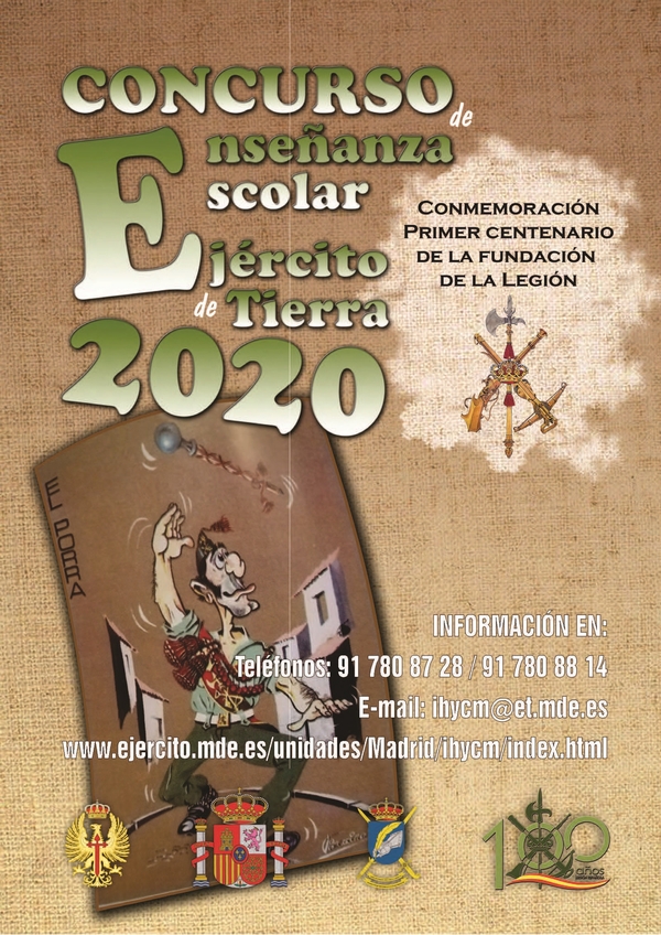 El Instituto de Historia y Cultura Militar del Ejército de Tierra, ha convocado el concurso de Enseñanza Escolar 2020, con el que pretende «propiciar el conocimiento, por parte de los centros de enseñanza, y en particular, de los jóvenes, de las múltiples actividades y la divulgación de la vida militar, así como conmemorar el Centenario y los valores que esta institución promueve.