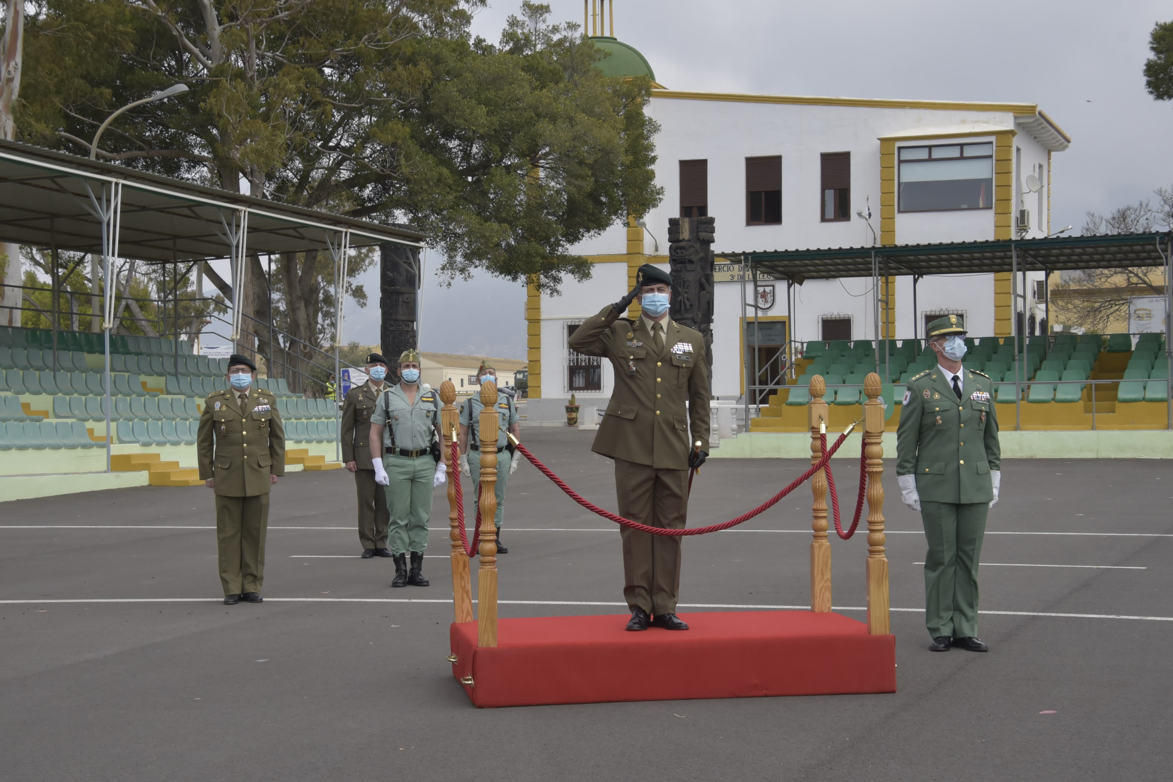 El acto de izado de bandera tuvo lugar en los Jardines del Descubrimiento. El general Marcos Llago, Jefe de la Brigada de La Legión, presidió la efemérides.
