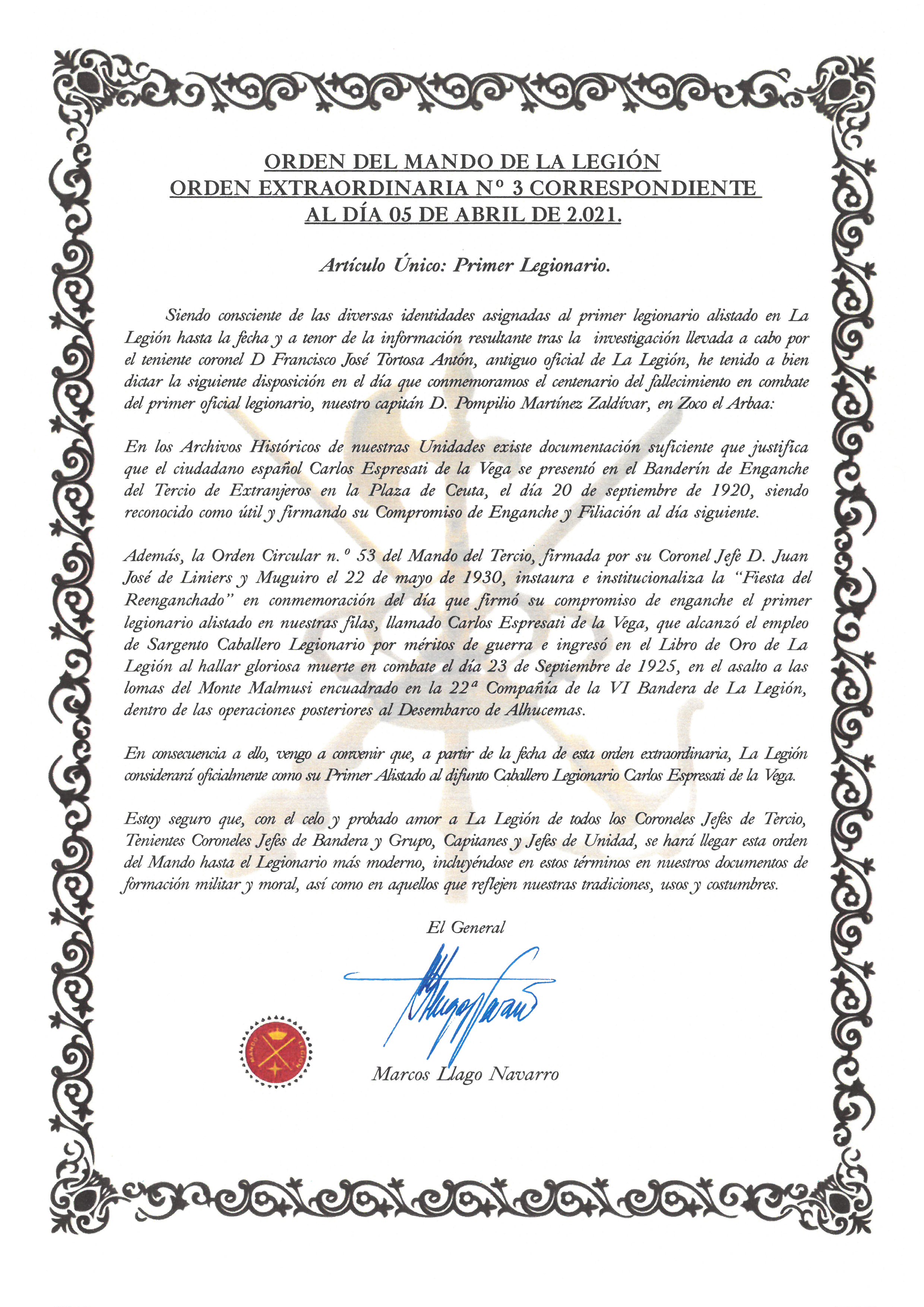 En Conmemoracion del primer Capitan de La Legión muerto en combate, se ha emitido por orden del Mando de La Legión, la orden extraordinaria nº3 correspondiente al día 5 de abril de 2021.