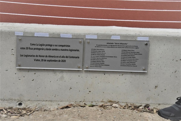 La asociación ha plantado 20 árboles a la orilla del nuevo recinto deportivo, recientemente inaugurado por la Diputación Provincial de Almería y la Unidad de Servicios a la Base de la BRILEG. La Arboleda de Sierra Alhamilla recordará a los caídos como una especie de monolito natural, un rincón para el recuerdo abierto a La Legión en el año del Centenario."Como la Legión protege a sus compatriotas, estos 20 ficus protegerán y darán sombra a nuestros legionarios", reza la inscripción.