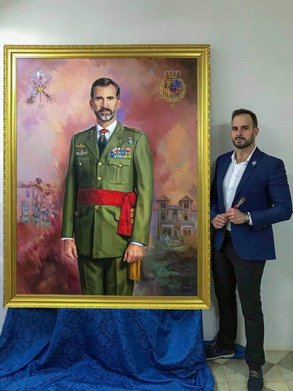 El pasado viernes 9 de octubre, el Rvdo. Sr. D. José María Sánchez García, Legionario de Honor, hizo entrega y donación a esta Brigada de un cuadro en óleo sobre lino, que representa a S.M. el rey Felipe VI con uniforme del Ejército de Tierra, realizado por el pintor jienense Felipe Herreros Rodero. En la obra, el Rey se presenta solamente, trasmitiendo autoridad y realeza, a la par que nobleza de su personalidad. Tratado con hiperrealismo y mímesis en la pincelada, destacan la rotundez de las manos y el rostro, el cual, habiendo utilizado la anarkasis sostiene permanentemente su mirada ante quien lo contempla. Tras él y favoreciendo el primer plano de la figura, envuelve una atmósfera en tonos carmesí y rojizos, en alusión a las tonalidades de la bandera real y la sangre derramada de los legionarios, emerge en el lado diestro el edificio del Cuartel General de la Base "Álvarez de Sotomayor", tratado de modo fugaz pero reflejando la arquitectura de su fachada. En el lado opuesto se presenta la escena de los legionarios portando a su protector el Cristo de Buena Muerte, de quien surge la luz de la vida que inunda ese lado del cuadro. Timbran la composición el escudo de La Legión Española y las Armas Reales.