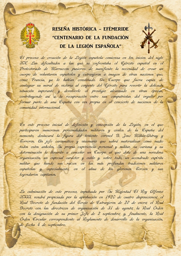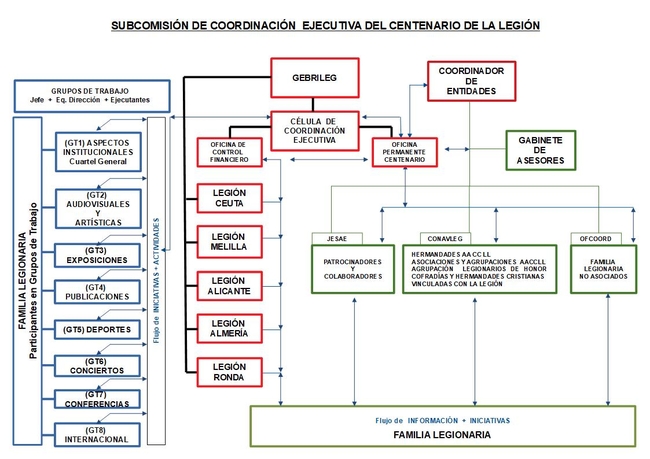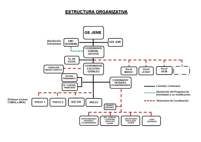 - Oficina Permanente del Centenario es un Órgano de trabajo de la Comisión del Centenario, esta oficina dirigida por al coronel D. José Úbeda León, auxiliado por el teniente D. Luis Gracia Cirugeda, ambos en situación de reserva y con gran experiencia en La Legión; esta oficina es la responsable de auxiliar a GEBRILEG en la coordinación y el control del programa de actividades, así como todo tipo de actuaciones que vayan a ser incluidas en el marco del Centenario exceptuando las relacionadas con la gestión y control financiero, para ello se ha creado el correo electrónico oficina_permanente_del_centenario_de_la_legion@mde.es donde se pueden canalizar todas las iniciativas.