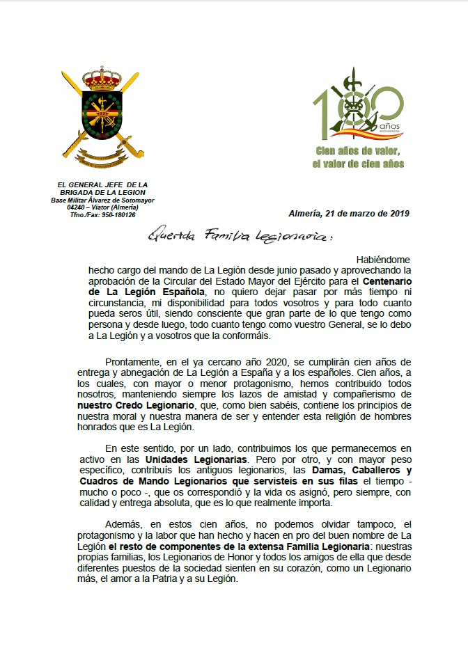 Carta por el inicio del Centenario enviada por el general de la BRILEG