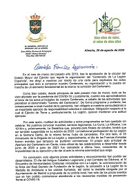 El general de la BRILEG, en una carta fechada el 26 de Agosto del 2020 enviada a toda la Familia legionaria, expone las consideraciones y líneas de acción que la situación sanitaria que se vive en España obliga a adoptar.